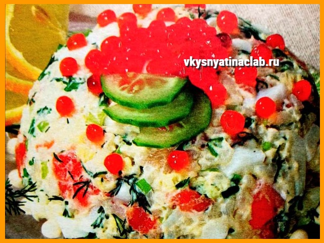 - Сервировка: Огурец и лимон нарезать тонкими ломтиками. На подготовленный салат выложить икру, для придания ему более праздничного вида и изысканного вкуса. Украсить дольками огурца и лимона. Он прекрасно сочетается с белым хлебом или хрустящими гренками.